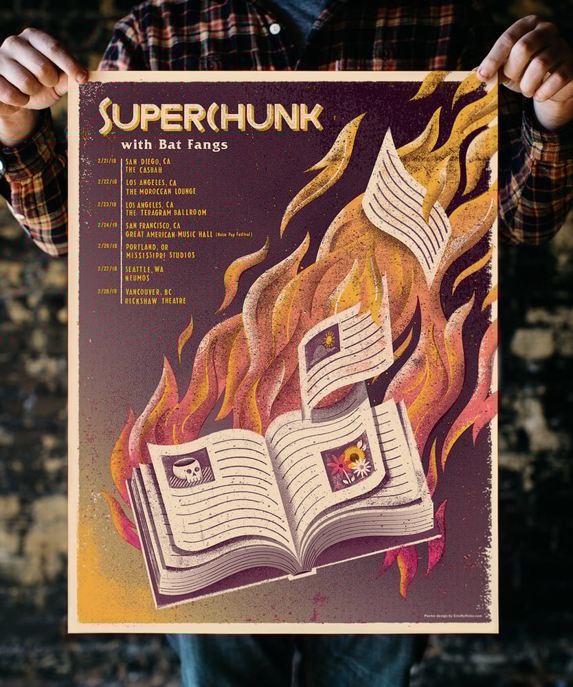 I've been making posters for Superchunk for pretty much as long as I've been making posters, so when it came time to make a tour poster for their outrageously good new album "What a Time to Be Alive," you'd better believe I jumped at the chance. A book going up in flames seemed to be the perfect metaphor for the state of our world right now.